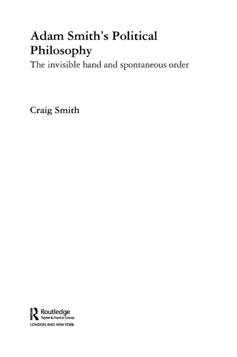 When Adam Smith published his celebrated writings on economics and moral philosophy he famously referred to the operation of an 'invisible hand'. Adam Smith’s Political Philosophy makes visible this hand by examining its significance in Smith’s political philosophy and relating it to similar concepts used by other philosophers, thus revealing a distinctive approach to social theory that stresses the importance of the unintended consequences of human action. The first book to examine the history of Smith’s political philosophy from this perspective, this work introduces greater conceptual clarity to the discussion of the invisible hand and the related notion of unintended order in the work of Smith, as well as in political theory more generally. By examining the application of spontaneous order ideas in the work of Smith, Hume, Hayek and Popper, this important volume traces similarities in approach, and from these constructs a conceptual, composite model of an invisible hand argument. While setting out a clear framework of the idea of spontaneous order, the book also builds the case for using this as an explanatory social theory, with chapters on its application in the fields of science, moral philosophy, law and government.