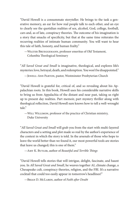 Like Barbara Kingsolver's brilliant Demon Copperhead, a Pulitzer Prize winner, All Saved Great and Small transports the reader deep into the heart of rugged Appalachia, a part of the country not understood by most people. Lawlessness and poverty plague the region. A star athlete, Finn Boone struggles to rise above his bootlegging father and his father's murderous behavior. A person of Melungeon descent, Grace Goins fights against racism and prejudice. When their teenage love is forbidden, they go their separate ways in life. Over forty years later, FBI Special Agent Finn Boone, a reluctant preacher, and Dr. Grace Goins, a Presbyterian theologian and an expert on religious cults for the Department of Homeland Security, find themselves on the same team trying to stop a brilliant, rogue scientist who is willing to destroy human civilization to save the planet from the climate crisis. How many must die? Will the scientist be found before he unleashes a terrible AI weapon to force world governments into action? Members of the team are shocked when they discover the identity of the scientist who claims to be a descendant of Mary, mother of Jesus, and has the DNA evidence to prove it.