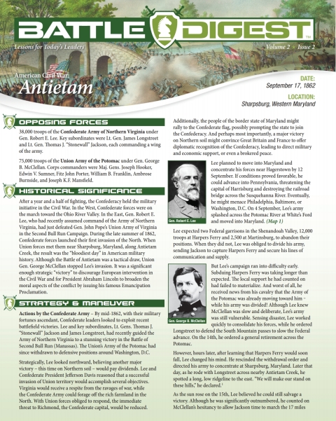 Get facts, maps, historical significance, strategies, and more in this concise summary of the notoriously bloody Civil War battle. During the late summer of 1862, Confederate forces launched their first invasion of the North. When Union forces met them near Sharpsburg, Maryland, along Antietam Creek, the result was the “bloodiest day” in American military history. Although the battle of Antietam was a tactical draw, Union Gen. George McClellan stopped Lee’s invasion. It was a significant enough strategic “victory” to discourage European intervention in the Civil War and for President Abraham Lincoln to broaden the moral aspects of the conflict by issuing his famous Emancipation Proclamation. Learn why Robert E. Lee took great risk in dividing his army as he moved north, and how General McClellan squandered an opportunity for victory with his uncoordinated assaults during the battle. The Battle Digest summary includes all the key aspects of the campaign and battle, including maps, images, and lessons learned.