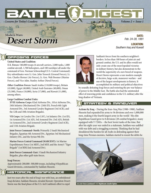 A concise guide to the American-led coalition’s speedy defeat of Saddam Hussein in 1991, with maps, facts, historical significance, and more. Just two years after the end of Iraq’s war with Iran, an emboldened Iraqi dictator, Saddam Hussein, invaded Kuwait. Operation Desert Storm was the final phase of the U.S.-led Coalition’s effort to expel Saddam’s forces from his southern neighbor’s borders. In less than 100 hours of joint air and ground combat, the U.S. and its allies would not only triumph, but also demonstrate to the world the superiority of a new breed of weapons. The battle also had the unintended effect of renewing a pride and confidence in the U.S. military after the long shadow of Vietnam. Learn how America built a coalition of nations to go to war, and how Gen. Norman Schwarzkopf used maneuver and deception to create one of the most lopsided victories in the history of warfare. The Battle Digest summary includes all the key aspects of the campaign and battle, including maps, images, and lessons learned.