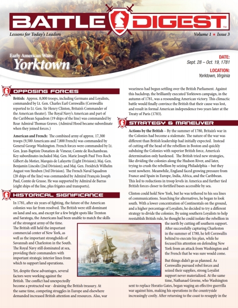 A concise guide to this resounding American victory in the Revolutionary War, with facts, maps, historical significance, and more. In 1781, after six years of fighting, the future of the American colonies was far from resolved. The British were still dominant on land and sea, and except for a few bright spots like Trenton and Saratoga, the Americans had been unable to match the skills of the strongest army of the time. Against this backdrop, the brilliantly executed Yorktown campaign, in the autumn of 1781, would effectively decide the war. With America’s resounding victory, the American Colonies would formally gain their independence two years later. Learn how General Washington outfoxed the British with deception and maneuver, while the French Navy cleared the way for the final checkmate of General Cornwallis at Yorktown. The Battle Digest summary includes all the key aspects of the campaign and battle, including maps, images, and lessons learned.