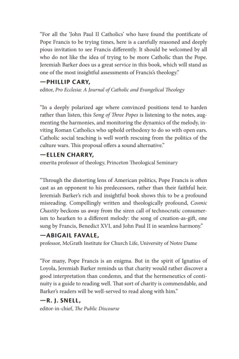 This book arises from the conviction that the ways in which John Paul II and Benedict XVI were confused as allies with American conservativism is as misleading, unclear, and confusing as any misapprehension of Francis's genuine orthodoxy. As the author does not have a stake in reacting against a liberal Catholicism that he sees dying out anyway, the bigger threat, in his view, sociologically, for the North American church, is falling into a right-wing tribalism--and Francis resists precisely that.First Things editor R. R. Reno, highly critical of Francis, has called for a redemption of hints and suggestions of a cogent argument in the Francis message. Jeremiah Barker reappropriates Reno's call as a call to draw out or highlight what he takes to be the underlying rationale of the Francis message. That underlying rationale, he compellingly argues, is strikingly identical to that of the two previous popes. Barker, who has learned much from Reno, is in fact inspired by Francis's call and teaching, and it is the aim of this book to draw out what inspires him and to identify what he hopes Reno and fellow 'John Paul II Catholics' don't miss in the Francis message: the theological, ethical, and spiritual core of his social teaching, which Francis shares with that of John Paul II and Benedict XVI.