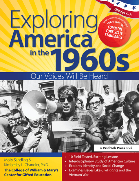 Exploring America in the 1960s: Our Voices Will Be Heard is an interdisciplinary humanities unit that looks at literature, art, and music of the 1960s to provide an understanding of how those living through the decade experienced and felt about the many social changes taking place around them. Through the lens of "identity," it explores why these changes occurred and lends an ear to the voices of the groups that clamored for them. Cultural icons like the Kennedys, the Beatles, Andy Warhol, and the Beach Boys are examined alongside larger issues such as the Civil Rights and women's rights movements and the Vietnam War. The unit uses field-tested instructional strategies for language arts and social studies from The College of William and Mary, as well as new strategies, and it includes graphic organizers and other learning tools. It can be used to complement a social studies or language arts curriculum or as standalone material in a gifted program. Grades 6-8