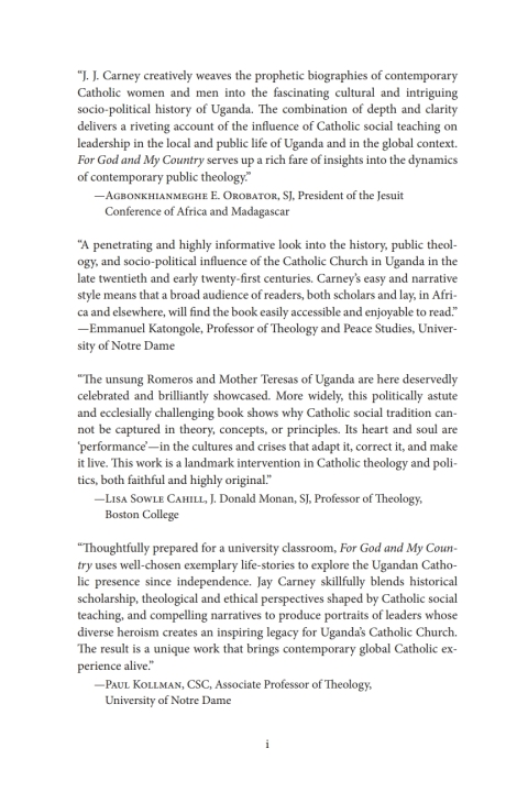 A devout Catholic politician assassinated by a capricious dictator. A Cardinal standing up for his people in the face of political repression. A priest leading his nation's constitutional revision. The "Mother Teresa of Uganda" transforming the lives of thousands of abandoned children. Two missionaries who founded the best community radio station in Africa. A peace activist who has amplified the voices of grassroots women in the midst of a brutal civil war.Such are the powerful stories in For God and My Country, a book that explores how seven inspiring leaders in Uganda's largest religious community have shaped the social and political life of their country. Drawing on extensive oral research, J. J. Carney analyzes how personal faith, theological vision, and Catholic social teaching have propelled these leaders to embody Vatican II's call for the Church to be a sign of communion and unity in the world. Readers will gain rich insight into Uganda's postcolonial politics and the history of one of Africa's most important Catholic communities. Each chapter closes with leadership lessons and reflection questions, making this an ideal text for classroom and parish adoption.