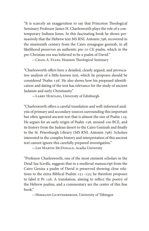 Jews and most Christians know about only 150 "Psalms of David"; they were collected in the Davidic Psalter of the (Masoretic) Hebrew Bible or Old Testament. Since about 200 BCE, the Greek translation of the Davidic Psalter contained 151 Psalms of David. Thanks to research on the Qumran Psalms Scroll and the early Syriac Bible, most scholars know about 155 Psalms of David, and they were included in the well-known Old Testament Pseudepigrapha as "Non-Masoretic Psalms." Virtually unknown to biblical scholars is Psalm 156. It is preserved in a medieval copy found in the Cairo Genizah, as are other major early Jewish compositions, notably the Damascus Document and the Testament of Levi. Psalm 156 is extensive and almost as long as Psalm 119. It preserves visions attributed to David. The work opens new windows for looking into the creative world of Second Temple Judaism.