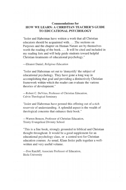 No one fully understands how learning works, but educational psychologists understand a great deal about what works. The collaborative team of Klaus Issler and Ronald Habermas has assembled an integration of theology and instructional theory in Teaching for Reconciliation: Foundations and Practice of Christian Educational Ministry. Now they expound on one aspect of educational theory/theology to help teachers choose the method that best reaches particular learners in a specific learning situation. How We Learn demystifies the principles of educational psychology. The book identifies: --means and barriers in learning- --motivational factors that make learners receptive --learning's outcome in attitudes, spirituality, and behavior Application sections, special exercises and examples, plus dozens of figures and tables aid understanding of learning effectiveness, age-related development, individual learning style, special education, and other issues.
