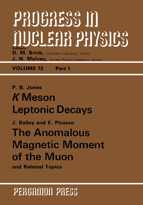 Progress in Nuclear Physics, Volume 12, Part 1: K Meson Leptonic Decay: The Anomalous Magnetic Moment of the Muon and Related Topics focuses on K Meson leptonic decay. The volume first discusses K Meson leptonic decay, including weak hadronic current, polarization of the muon, form of coupling, rate of partial decay, and density function of the Dalitz plot. The text then takes a look at the anomalous magnetic moment of the muon and other topics. The theory of the anomalous magnetic moment of electrons and muon and clock paradox, including muon and special relativity and lifetime of the muon in flight, are underscored. Experiments on the CERN muon storage ring and g-2 measurements are also explained. Numerical calculations and table representations showing the leptonic decay are then presented. The book is a dependable source of data for readers interested in the study of K Meson leptonic decay.