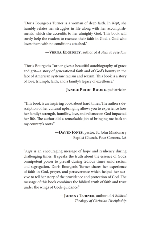 Kept: A Commentary on God's Providential Care in the Journey of a Plantation Girl is a spiritual source that shares the manner in which God intercedes and keeps us from ourselves. The presence of his hand and the intercession of his love, grace, favor, and mercy guide us through challenges and obstacles that may appear insurmountable. The role of God is evident in the author's life from the rural Louisiana plantation life to his favor in suburban living with people from other cultures. The focus of the book demonstrates the benefits of following and being obedient to God's direction. The book challenges us to step out on faith, trust God, and give him all the glory for all that is attained in our life.