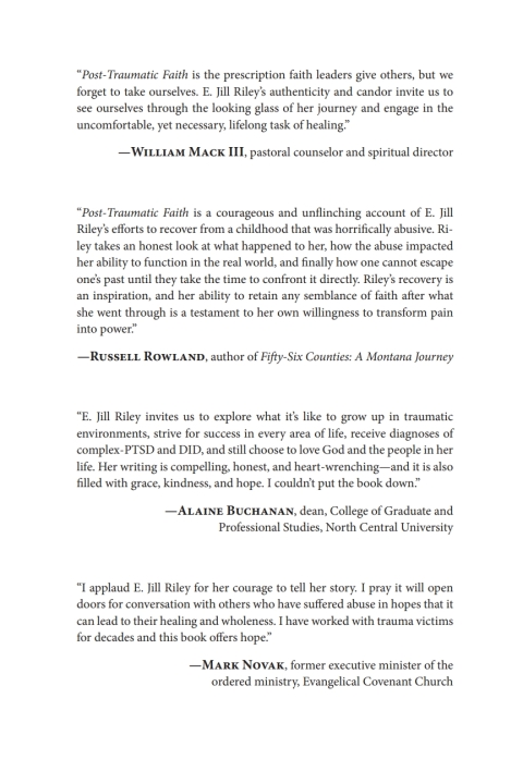 E. Jill Riley is not a good victim. However, she is a triumphant survivor who has scars to prove that wounds do not have to stay open forever. An orphan who was adopted into a culture of chaos and ineffable abuse, Jill suffers from complex PTSD and dissociative identity disorder. Follow her story from Seoul, Korea, to the deserts of Nevada and on to the beautiful North Idaho panhandle. Explore her life as a pastor in both new and established churches and then life as an inpatient in a psychiatric facility. Finally, walk with her as she discovers a newly imagined, full life of faith, despite severe mental illness.As a minister and survivor Jill is uniquely positioned to be a leading voice in the intersection of mental health, faith, and the church.