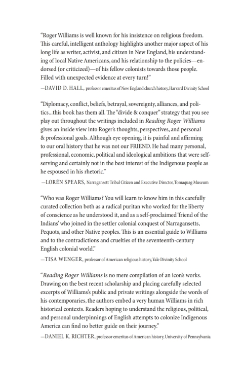 Roger Williams is best known as the founder of Rhode Island who was banished from Massachusetts in 1636 for his dangerous thoughts on religious liberty. But the city and colony Williams helped to found was deep in Native country situated between the powerful Narragansett and Wampanoag nations. The Williams that emerges from the documents in this collection is immersed in a dynamic world of Native politics, engaged in regional and trans-Atlantic debates and conversations about religious freedom and the separation of church and state, and situated at the crossroads of colonial outposts and powerful Native nations. Williams lived among and relied on the generosity of his Narragansett neighbors and yet he was a Native enslaver and part of a process that dispossessed regional Indigenous populations. He could establish a colony based on full religious freedom and yet bitterly complain and campaign against residents with whom he disagreed, such as Samuel Gorton or the Quakers. For the first time, Reading Roger Williams offers readers the opportunity to explore the many facets of Williams's life by including selections from all of his writings, starting with his life in London and ending with one of his final letters, written when he was nearly eighty years old. Each document includes an introduction and annotations to help the reader better understand the text and context.
