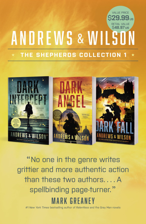 This collection features the first three thrillers in The Shepherds series by Andrews & Wilson. Dark Intercept On the eve of his medical retirement, Navy SEAL Jedidiah Johnson receives a frantic call from his estranged childhood best friend David Yarnell, whose daughter has been kidnapped. Police have no suspects and no leads. Jed reluctantly agrees to help, but soon dark memories and strange abilities he thought he’d put behind him resurface. To save the missing girl, he must take a leap of faith and embrace gifts he’s denied for years. Dark Angel When former Navy SEAL Jedidiah Johnson begins training with the Shepherds, he hears whispers of a name raising fear and anger among them. After years in prison, Nicholas Woland, who betrayed the Shepherds and joined their enemies, has been freed to execute a sinister plot causing hundreds of deaths and inciting worldwide religious warfare. As Woland and the Shepherds race toward a collision, Jed must rely on his untested team, never realizing a secret servant of the enemy is growing closer to him. Dark Fall As a new Shepherds team leader, Jedidiah Johnson’s tracking rumors of an energy-based weapon able to incinerate a human target without warning. With help from the Watchers, Jed discovers the Dark Ones’ leader plans to use the weapon to wreak untold damage and destabilize the faith of millions. While Jed and his team race to find and disable the weapon, secret plans for another attack unfold . . . and this target is much closer to home.