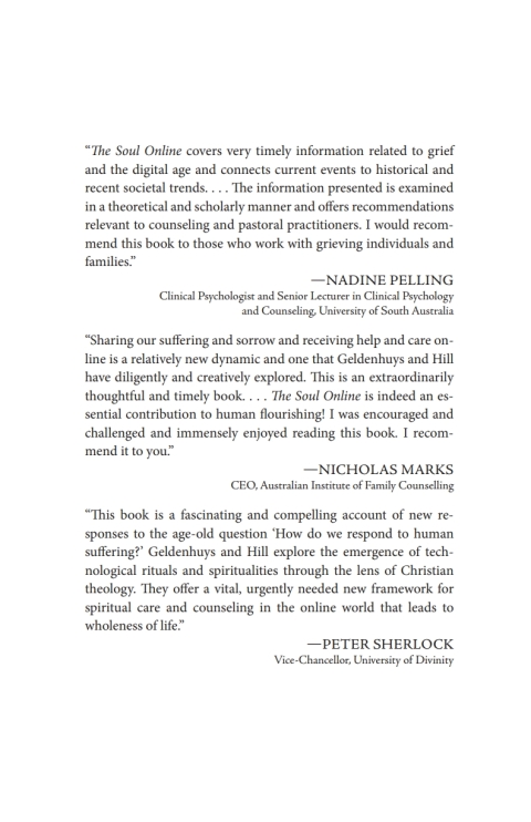 Pandemics, conflicts, and crises have increased suffering, death, and loss worldwide. The growing phenomenon of online interactions by the bereaved with the online presence of their deceased loved ones has recently come to the attention of caring professionals. Many questions emerge. How do we understand and respond to digital memorialization? What do we make of digital identities and continuing bonds? How can we engage with digital bereavement communities? What is the future of digital death and bereavement rituals and practices? How have forms of technospirituality and cybergnosticism emerged? How do counselors and carers respond to advances in the digital afterlife?Graham Joseph Hill and Desiree Geldenhuys examine existing therapeutic responses to death and bereavement practices and evaluate the efficacy in meeting the needs of mourners in a digital context. Geldenhuys and Hill explore the rising interest in spirituality and the phenomenon of technospirituality, including interest in the afterlife. The authors outline new death and bereavement practices in the digital public sphere. Hill and Geldenhuys offer ways that therapeutic and care practitioners can meet these needs. Finally, the authors develop new proposals for counseling, pastoral, and spiritual carers to help them address the needs of the bereaved.