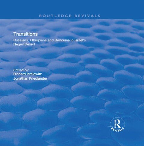 This title was first published in 2000: Comprising over one-third of the land area of Israel, the Negev is home to more than 400,000 residents representing one of the most unusual ethnic mixes in the world. Immigrants from many regions and countries: North Africa, Ethiopia, the Middle East, India, Europe, North and South America, and the Republics of the former Soviet Union, now reside in the Negev along with indigenous Bedouin Arabs and Jews born in Israel. Transitions is a dedication to the Negev people, brought together by Richard Isralowitz of Ben Gurion University, Israel and Jonathan Friedlander of the University of California, Los Angeles. It documents a year in the lives of three groups of people through carefully selected and expertly written chapters contributed by Israeli scholars familiar with issues of immigration and immigrant absorption, regional development, health, education, as well as racial and ethnic conflict concerning Russian, Ethiopian and Bedouin people of Israel’s arid southern region. The chapters are juxtaposed with the vivid and provocative colour and black and white images of photographer Ron Kelley who focuses on the process of assimilation, within the broader context of Israeli society, revealing complications of nationalism, ethnic rivalries and competition over limited resources, amidst a prevailing concern for national security. Prepared with support from the US/Israel Binational Education Foundation (Fulbright Scholars Program) and the Israel Council of Higher Education, Transitions is an extraordinary and unique study of people, their environment and interaction.